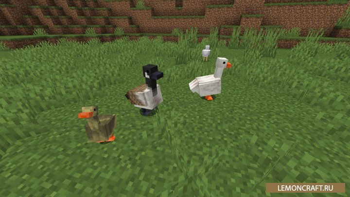 Мод на уток и гусей Untitled Duck добавляет в игру новых персонажей, уток и гусей, а так же несколько предметов непосредственно связанных с ними. Уток вы сможете разводить используя семена, а с самих уток получите перья. Так же утки умеют плавать, а если рядом с ними включить проигрыватель, начнут танцевать. Гусей так же можно разводить семенами, а приручать с помощью водорослей. Гуси отпугивают обитателе, как кошки криперов, а так же могут, как в реальной жизни, напасть на вас и выхватить находящийся у вас в руках предмет.
